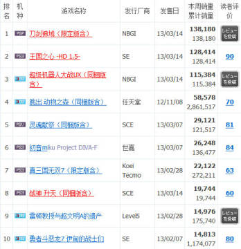 最新日本游戏销量排行榜 PSP《刀剑神域》登顶 来源: 飞翔小编feichenpan 2013/3/21 9:12:44 浏览量:656 根据最新一期日本游戏软件销量排行榜情报,PSP新作《刀剑神域》凭借首周销量13万获得冠军,PS3复刻移植版游戏《王国之心HD1.5》获得第二名的位置,3DS最新机战作品《超级机器人大战UX》获得第三名的位置。第四名被社交游戏大作3DS《动物之森》占据着,而PSV平台原创作品《灵魂献祭》凭借优秀素质这周也取得了近3万的销量,累计12万套,实在是可喜可贺。日本游戏软件销量排行榜(2013年3月11日-3月17日):