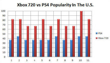 谷歌网站近期进行了一项有关次世代主机PS4和XBOX720的调查,通过玩家在过去11个月里搜索,看看哪台新主机更受玩家欢迎,而其结果为在谷歌网上搜索XBOX720的数量明显的多于同期搜索PS4的数量。