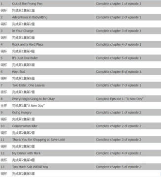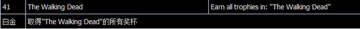 《行尸走肉》奖杯成就攻略详解 来源: 飞翔小编feichenpan 2013/3/25 14:53:46 浏览量:1686 动作冒险游戏《行尸走肉》在PC平台大获好评后,又登陆了家用主机平台PS3和XBOX360,该作的PS3版包含奖杯成就要素,由于本作的奖杯全部都属于剧情奖杯,所以只要通关一遍即可白金,游戏中的选项只影响各角色的态度和救援的人,只要在战斗和突发事件中保证不死亡,其实死了也没关系,有CheckPoint,无论剧情中选择任何选项都可以通关,获得白金奖杯。这里就给各位PS3玩家分享下《行尸走肉》奖杯攻略详解,希望大家喜欢。下面是奖杯获得方法列表,XBOX360版本的成就也同样适用。
