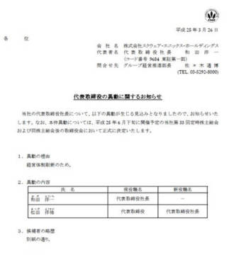 SE公司近几年不思进取,一直都以复刻移植作品来敷衍玩家,一大推的《最终幻想》系列作品的推出严重透支了品牌效应,而作为公司CEO的和田洋一难辞其咎。根据SE公司董事会近期发布的声明,和田洋一已经本着对公司巨大亏损负责的态度引咎辞职,目前SE的首席财务官松田洋佑将在2013年6月份召开的第33期年度股东大会之后正式接替社长一职。