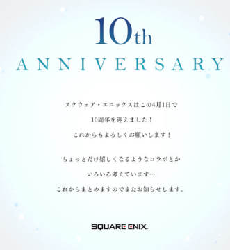 Square Enix合并十周年纪念作品将于E3电玩展亮相 来源: 飞翔小编feichenpan 2013/4/1 16:54:56 浏览量:187 在2003年的4月1日,日式RPG大厂Square和Enix公司宣布合并,时至今日已是Square和Enix公司合并十周年纪念,为此Square Enix官方特意放出纪念网站以庆贺,据悉目前至少有3款原创新作正在紧张开发中,其中首款10周年纪念作品将会是一款集合旗下人气角色的乱斗型游戏,预定于今年的E3电玩展上展出。另外Square和 Enix各有一款知名系列的正统续作会在下半年陆续揭晓,很有可能是《最终幻想15》和《勇者斗恶龙11》,敬请期待。