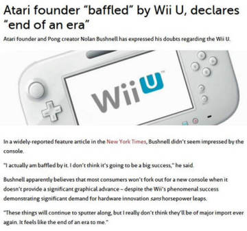Nolan Bushnell表示,作为新主机没有强大的硬件性能是行不通的,WiiU带来的显卡性能提升微乎其微,消费者不会去买单的。Wii是一个例外,同样的招数不能使用两次。Nolan Bushnell坦诚,事实上自己对WiiU感到莫名其妙,认为这主机是不可能获得热卖的,随着时间推移,任天堂巨大的市场份额难保。