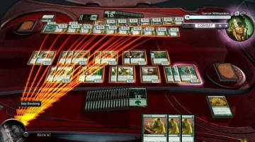 用Baneslayer Angel阻挡Vorinclex,Volce of Hunger,给Baneslayer Angel加Brute Force和Glant Growth,之后Jace打出Thought Scour,此时利用手上的Parallectric Feedback打掉Jace 1点血。轮到本方回合,由于对面的Sheoldred,Whispering One,牺牲Baneslayer Angel,抓到一张Sizzle,打出后结束战斗。