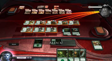 用Baneslayer Angel阻挡Urabresk the Hidden,给Baneslayer Angel加Brute Force。轮到本方行动,Jace打出Thought Scour,不用理他,之后Bneslayer Angel牺牲,打出Avatar of Hope,再打出Burst of Speed,之后进攻,使用Giant Growth,结算后结束战斗。