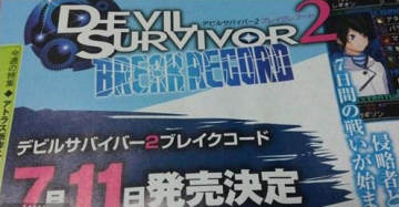 ATLUS公司最近通过游戏杂志透露了3DS复刻大作《恶魔幸存者2断码》的发售日,该作预定于2013年7月11日发售。据悉新作在NDS《恶魔幸存者2》的基础上进行了全程语音化,追加了动画部分对应3D画面,还有新剧情以及名字不明的女性新角色。值得一提的是新作追加了可以简单游戏的模式,即使是初学者也可以毫无压力通关。