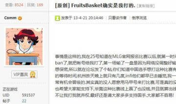 Comm澄清贴子原文内容:事情是这样的,我在25号知道在MLG官网报名比赛以后,就第一时间报名了,俱乐部的几个也是第一时间报名的,昨天晚上10点钟准时签,,可是等到后面却没有我们的名字,FruitsBasket是我的徒弟,他看到我被老美ban了,就把帐号给我打了,第一场输了一盘是因为网络没调整好输了一盘,就跟后面对阵hendralisk输了一盘一样,开局刚刚2分钟,我网络掉线就被老美叛负,说游戏开始大于1分钟就叛负,当时第一场赢了,FruitsBasket想保密,所以就在论坛发了个帖,你们知道中国选手想打这种比赛有多么难吗,首先报名就很困难了,然后从半夜2点开始打,虽然一直晋级,理论上来说白天打7个BO3也不会特别累,可是是持续通宵作战的,中间还有漫长的等待时间,杭州昨天晚上就只有几度,infi他们都早已去睡觉,我一个人坚持在电脑面前,为了不睡着了,一直在洗冷水脸,坚持下来,最后10点半打THESTC的时候我注意力已经完全集中不了了,结果还是败了,不然还是非常有机会晋级的。其实真的没人愿意用马甲号来打比赛,可是真的没办法,我想争取走得远点,证明下中国选手也是有实力的,不能让美国人看不起我们,抱着能走多远走多远的信念一直坚持下来,最后就打到现在这样了。也希望大家能支持下,毕竟这种比赛线上赢了也没钱,并且就算出线了还是要面临签证等等难题,我熬夜到11点半顶着被喷的压力来打这个比赛,只是想证明下中国选手的实力。如果MLG觉得我用马甲打不行的话,他们不让我打我就弃权。最好还是请大家多多支持国手。大家都不容易!
