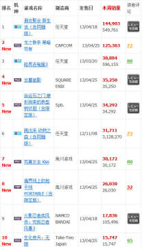 《朋友聚会》继续领衔新一期日本游戏销量排行榜 来源: 飞翔小编feichenpan 2013/5/2 14:35:45 浏览量:214 根据最新一期日本游戏销量排行榜的显示,任天堂3DS社交游戏大作《朋友聚会 新生活》还是继续排名首位,本周销量高达14.4万套,已累计54.9万套。而Capcom最新上市的冒险动作游戏《龙之信条 黑暗觉者》其首周就取得12.5万套销量,实在是可喜可贺。获得第三名的是任天堂3DS游戏《路易鬼屋2》,凭借3D裸眼技术和出色的关卡射击,让路易鬼屋系列重获新生。最新一期日本游戏销量排行榜 (2013年4月22日~4月28日):