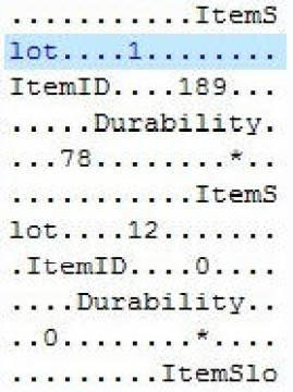这一块是英雄的装备修改,itemslot是装备位置,如1是右手武器,itemID就是装备的编号了。这游戏虽然没显示,但其实是把装备分割成低级装备和高级装备的。高级装备编号都是三位数。也就是说,你要修改高级装备,就必须要先得到编号为三位数的装备。修改只用修改itemID就行,位置是否正确没关系,哪怕不一样,修改后取下来在装备就好。甚至不取下来装备属性都会作用。也就是说,你大可以右手双手剑左手盾,甚至全身武器都行。就防具而言,以编号排列的顺序是轻-中-重。