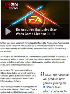 根据外媒IGN的最新消息,EA已经与迪斯尼公司签订协议,将与其合作发行未来的星球大战系列游戏。协议上声明两家公司已经建立一项新的多年合约,包括授权EA在全世界开发与发行基于《星球大战》人物设定的游戏。而EA将针对主流玩家群体开发与发行星战游戏,横跨各大平台及游戏类型,同时迪士尼保留开发移动、社交、平板、页游的权力。