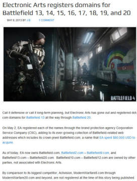 EA做长期发展 注册《战地13》至《战地20》的域名 来源: 飞翔小编feichenpan 2013/5/9 9:35:24 浏览量:540 EA公司准备要将射击游戏《战地》系列做长期发展,于是一口气注册了从Battlefield13.com到Battlefield20.com的域名,当然也有玩家认为EA官方的此次行为是为了防止恶性注册,根据调查得知,Battlefield10.com ~ Battlefield12.com的域名使用权被与EA毫无关系的企业注册,Battlefield21.com的使用权被网站Rock, Paper, Shotgun获得。