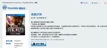 根据信息显示,《讨鬼传》 PSV版试玩版的港服版本将会在2013年5月16日上架,想体验游戏而又苦恼于是否要转日服的玩家这下可以放心了,只要再等几天就能够直接在港服上下载到本作的试玩版版。