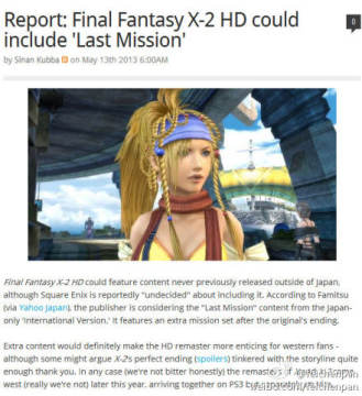 《最终幻想X/X-2 HD》将免费追加国际版最终任务 来源: 飞翔小编feichenpan 2013/5/15 0:46:41 浏览量:565 根据外媒joystiq的报道显示,Square Enix已经考虑将国际版中的Last Mission(最终任务)免费加入到《最终幻想X/X-2 HD》之中,而不是作为DLC发售,这对于各位玩家而言算是个好消息。《最终幻想X/X-2 HD》是PS2经典游戏的高清复刻,而该作官方中文版也将同期登陆PS3和PSV平台,各位国内玩家敬请期待。