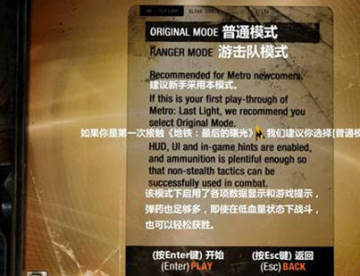 《地铁最后的曙光》大家期待已久,但是英文不好的同学玩起来也是很困难。下面是游戏选项中文翻译,希望可以帮助大家顺利进入游戏。