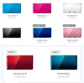 下面是任天堂3DS掌机曾经推出的8种颜色,其中火焰红”和“水晶蓝”已经停产。
