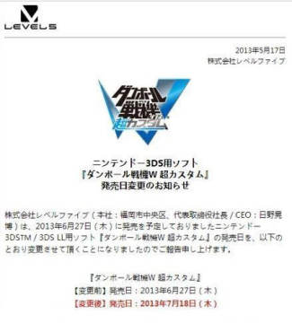 《纸箱战机W完整版》延期至2013年7月18日发售 来源: 飞翔小编feichenpan 2013/5/17 11:47:50 浏览量:589 Level5公司近期宣布原定于2013年6月27日发售的3DS游戏《纸箱战机W完整版》将延期上市,其最新发售日为2013年7月18日。官方表示其延期原因为进一步提高游戏品质。该作是PSP平台《纸箱战机W》的加强版游戏,收录其所有游戏内容,并且追加了大量DLC,其中包括米歇尔篇,想要玩到该作的3DS玩家要多等一个月左右了。官方声明表: