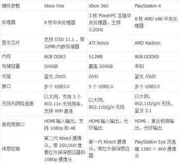 次世代主机XBOX ONE和PS4硬件配置对比图公布 来源: 飞翔小编feichenpan 2013/5/22 15:54:44 浏览量:4275 微软近期公布了旗下新一代游戏主机XBOX ONE,从官方公布的硬件配置来看,由于其不兼容XBOX360的游戏软件,再加上索尼PS4将于2013年末登场,所以这三款游戏主机可能会在同期内相互竞争,下面是热心玩家做的XBOX ONE,XBOX360和PS4的硬件配置对比图,可以看出XBOX ONE和PS4的差别不太大,都是采用8核CPU以及8GB内存。XBOX ONE,XBOX360和PS4的硬件配置对比图: