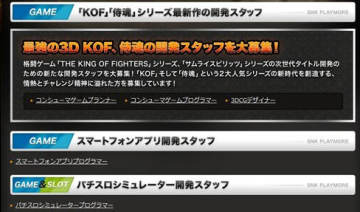 众多周知,SNK一直安逸于2D游戏的设计布局,但随着次时代的来临,他们终于坐不住了。日前在SNK官网上出现了《拳皇》《侍魂》3D开发人员的招聘与募集信息,游戏企划、消游戏程序员、3DCG设计师甚至智能手机应用程序员、游戏导演等职位历历在目。这样看来,SNK也开始重新筹划自己的次世代定位与布局了。