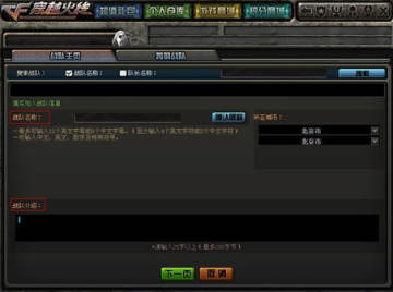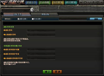 玩家输入“战队密码”,战队密码保护问题和答案后,即可创建一支战队。