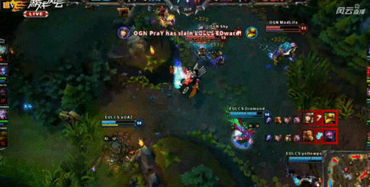 3分钟,寡妇游走中路逼出杰斯闪现,凯南晕住杰斯 成功拿下一血