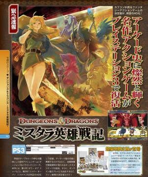 曾经的街机不朽名作《龙与地下城》系列游戏将高清移植PC,PS3和XBOX360平台,新作名为《龙与地下城 秘影历代记》,预定于2013年8月22日发售。现今Capcom官方公布了该作PS3限定版内容,除了游戏本体外,其还将附赠两张原声CD大碟,指令卡,胶垫,带封套的通关文件以及游戏专用书籍,极具收藏价值,其整体售价高达12000日元,折合人民币约为727元。