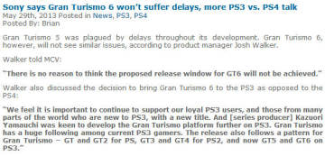 根据外媒gamingeverything的新闻报道,索尼旗下独占游戏《GT赛车6》将会如期上市发售,登陆PS3平台,绝对不会像《GT赛车5》一样出现延期状况,GT赛车系列的产品经理Josh Walker表示制作人山内一典将在PS3上把新作打造到极致,所以其在短时间内不会登陆PS4,而且遵循GT赛车系列游戏的发售规律。