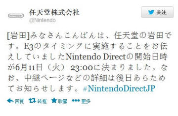 任天堂今年将不会在E3电玩展上单独举行新闻发布会,不过其社长岩田聪在任天堂日本官方的推特上表示,面向E3的“Nintendo Direct”网络直面会将于6月11日晚上11点直播,此次直面会的重点是介绍WiiU游戏新作以及3DS平台今年秋季以后的游戏阵容。