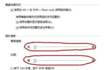 3.点击右上方的"更改鼠标的工作方式",到这个界面后分两步来关掉两处鼠标加速功能,首先点击偏下方的"设置鼠标键",然后找到指针速度一栏,如上图把"最高速度"和"加速"都拉到最左。这一步很关键,XP系统用不到,而绝大部分WIN7系统用户根本不知道这一项。