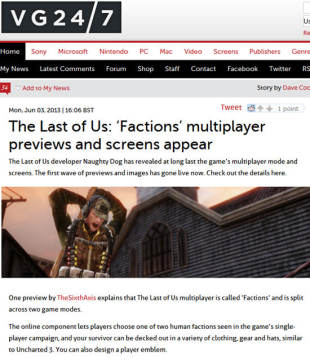 索尼旗下顽皮狗工作室继《神秘海域》系列之后又一原创作品《末日余生》(The Last of Us)备受PS3玩家瞩目,官方之前只曝光了本作单机剧情,有关多人模式的消息透露很少,不过临近游戏发售日,官方还是公布了《末日余生》多人模式截图,从中可以看出玩家在该模式将扮演末日生还者,与其他玩家上演互相残杀的场面,不知道是否还包含生存模式,玩家们要抵抗一波又一波的感染变异人群,这只有等游戏的正式发售了。