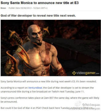 根据外媒videogamer的消息报道,索尼旗下圣莫妮卡工作室将在E3 2013电玩展上公布游戏新作,其很有可能登陆次世代主机PS4平台的《战神4》。如果这个消息属实的话,圣莫妮卡将如何为《战神3》结局奎托斯的留下的血迹做解释呢?难道真是凤凰涅槃再获新生,去阻止雅典娜的野望?只希望不是狗尾续貂就好了。