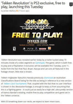 系列新作《铁拳 革命》将于6月11日免费登录PS3 来源: 飞翔小编feichenpan 2013/6/9 10:37:33 浏览量:267 国外游戏媒体joystiq报道了一则有关铁拳系列新作的消息,近日名为《铁拳 革命》(Tekken Revolutio n)被曝光,目前可以确定的是该作将是一款免费游戏,预计于2013年6月11日独占登陆PS3平台,至于其游戏类型还不得而知,考虑到之前的《铁拳》系列卡牌对战游戏,系列玩家请保持观望态度,详情等待KT官方进一步的情报公布。