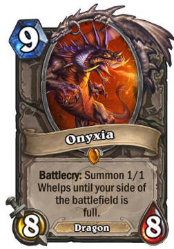 之前奥妮克希亚的能力为:“每次抽牌时,对所有角色造成2点伤害。”不过现在,她将用新的能力威胁所有对战玩家:“战吼:召唤1/1幼龙,直到布满己方的战场为止。”