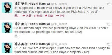 近日白金工作室的游戏制作人神谷英树在其推特上表示,《猎天使魔女2》是任天堂出钱开发的游戏,除非是任天堂强烈要求推出PS3和XBOX360版本,否则该作将是WiiU独占作品,神谷英树还像需求PS3版玩家打趣的说:“你应该向任天堂索要PS3版的塞尔达传说”。