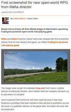 《黑手党》系列制作人将打造开放世界RPG新作 来源: 飞翔小编feichenpan 2013/6/25 10:51:55 浏览量:386 根据游戏媒体gamespot的报道,《黑手党》系列制作人目前成立了一家新的游戏工作室Warhorse Studios(战马工作室),现今其正在打造开放世界的RPG新作,游戏类型将会是角色扮演类冒险,利用业界知名的CryEngine引擎打造,下面就是该新作首张截图,可以看出画面效果十分逼真,已经接近照片级别。