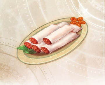 肠粉:广州美食,以米浆隔水蒸熟为粉皮后,包裹馅料卷制而成。