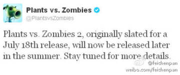 《植物大战僵尸2》将延期至2013年夏季发售 来源: 飞翔小编feichenpan 2013/6/27 21:24:42 浏览量:325 根据《植物大战僵尸》官方推特的最新情报,预定于7月18日发售的新作《植物大战僵尸2》将延期至今年夏季发售,希望玩家耐心等待。据悉该作将免费登陆iOS平台,但包含大量的内购项目。游戏剧情将横跨东西,穿越古今,时间轴包括狂野的美国西部、古老的埃及文明以及大航海的海盗时代,有新型植物和僵尸。