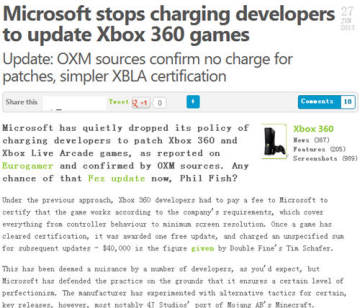 在以往XBOX Live平台上,开发商在替自己旗下XBOX360或者XBLA游戏开发升级补丁需要交给微软一笔费用,这项政策已经困扰了一系列开发商,但微软坚称这是为了保证某种程度的完美主义,鼓励开发商尽可能在发售之前完善游戏。近期微软废除了该项政策,这很明显帮助了小型开发团队,因为他们不像大型开发商一样有足够的资源测试游戏,尽管微软保留了收取更新过度的权利。