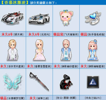 活动方式:在商城直接购买“香慕冰激凌”,打开即有机会获得永久A车【银天使】、永久A车【北极光】、极品宠【飞天猪猪侠】、极品【执手偕老戒指】、极品【浩宇凌风/香腮落雪套装】、极品【御影幽弥/御影幽魅套装】或其他奖励之一。