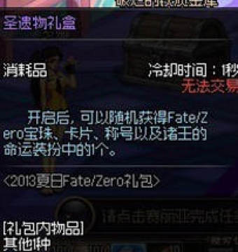 开启之后,可以随机获得Fate/Zero宝珠、卡片、称号以及诸王的命运装扮中的1个。