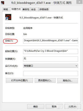 建一个游戏启动程序 fc3_blooddragon.exe ( 或fc3_blooddragon_d3d11.exe)的快捷方式,右键快捷方式,查看属性