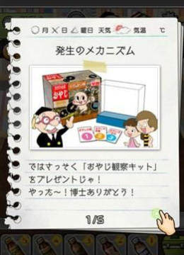游戏为种爸爸赋予了一个伟大的旗号:科学研究,玩家所扮演的小盆友要在科学家的带领下完成各种课题实验,最终探索并记录日本不同地区中年人所具备的生态习性。