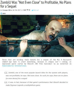 育碧CEO表示WiiU独占游戏《丧尸U》尚未盈利 来源: 飞翔小编feichenpan 2013/7/9 9:49:01 浏览量:273 育碧CEO近日接受外媒gameindustry采访时WiiU平台独占游戏《丧尸U》(Zombi U)目前尚未盈利,所以就一直没有续作计划,有鉴于此,育碧才把《雷曼 传奇》由WiiU独占改为跨平台发售。育碧CEO说道:“《丧尸U》作为WiiU最受人喜爱的游戏之一,其离盈利还差很远,所以没有续作计划,鉴于这个游戏的表现,育碧把《雷曼 传奇》制作成跨平台作品,尽管育碧多次声称支持这款作品,但是现实情况不是很乐观,我们必须保证我们的游戏有足够大的受众群。”
