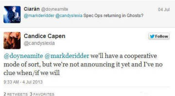 几天之前,游戏开发商Infinity Ward的社区管理员Candice Capen在Twitter上泄露了有关消息。有网友问到在《使命召唤10:幽灵》中,特殊行动(Spec Ops)模式会不会回归,Capen答道:“我们确实有某种类似的合作模式,不过我们现在还不打算公布这个,而且我不知道我们会什么时候公布,甚至不知道究竟会不会公布它。”