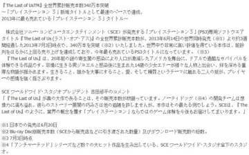 迄今为止,索尼PS3独占大作《美国末日》(The Last of Us)全球累计销量突破340万套,该作目前是PS3原创作品中销售速度最快,也是2013年现今最热卖的PS3游戏。《美国末日》制作商“顽皮狗工作室”向各位玩家证明了除了《神秘海域》系列,他们还能够创造出新概念的超强游戏体验。