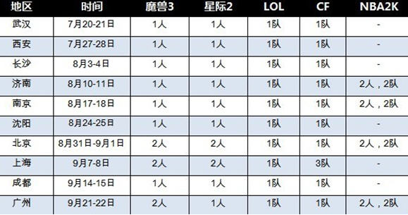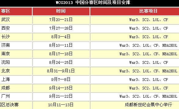 WCG中国区组委会于7月10日在上海召开发布会,公布了WCG2013中国分赛区的详细信息。WCG2013中国区将会设10个分赛区,分别为:武汉、西安、长沙、济南、南京、沈阳、北京、上海、成都和广州。分赛区下设魔兽争霸3、星际争霸2、英雄联盟、穿越火线和NBA2K共五个比赛项目。WCG2013中国区总决赛将首次离开上海,于10月11—13日在成都新世纪会展中心举行。以下为各大分赛区具体信息: