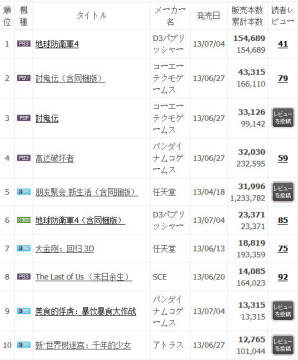 《地球防卫军4》获得新一周日本游戏销量冠军 来源: 飞翔小编feichenpan 2013/7/11 10:19:02 浏览量:444 根据外媒MC上周统计的日本游戏销量,PS3平台第三人称动作射击游戏《地球防卫军4》获得首位,其首周销量就高达15.4万套,实在是可喜可贺,这款以猎杀巨大外星昆虫为主题游戏能受到玩家欢迎,不得不佩服制作商的取材独特;获得第二名的是PSV平台和风狩猎新作《讨鬼传》,本周斩获4.3万套销量,累计销量达到16.6万;第三名游戏同样的《讨鬼传》,只不过是PSP版本,本周斩获3.3万套销量,累计销量达到9.9万。上周日本游戏销量前十位:
