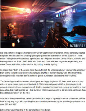Geomerics公司曾经开发了Enlighten光照引擎系统,该引擎系统被应用于许多游戏之中,例如大红大紫的《战地3》,媒体询问Geomerics,PS4至多可以采用7GB GDDR5内存容量于游戏当中,与XBOX最多只能使用5GB DDR3内存有什么差异,他们回答本世代主机由于内存仅有512MB,因此全局光照的数据要被挤压到10-20MB大小,而次世代双机对他们的光照引擎来说都相当足够了。