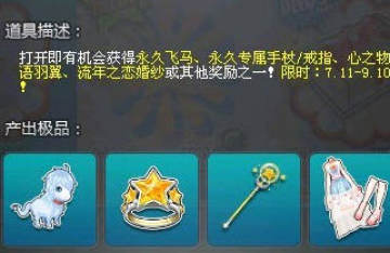 打开即有机会获得极品宠【飞马】、永久极品【高贵金星背景】、永久极品【高贵金星手杖】、极品【流年之恋服饰/流年之恋婚纱】、极品【心之物语羽翼】【凤凰神翼】、极品【高贵金星戒指】或其他奖励之一。