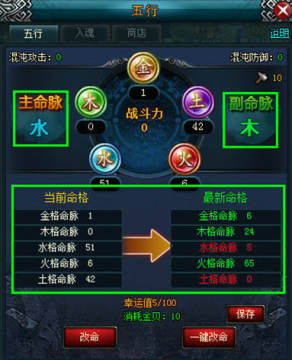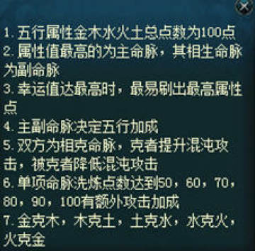 3、通过洗炼获得主命脉,主命脉将参照五行相克的原理。克方混沌攻击力升为120%,被克方混沌攻击力降为80%。(金克木,木克土,土克水,水克火,火克金)