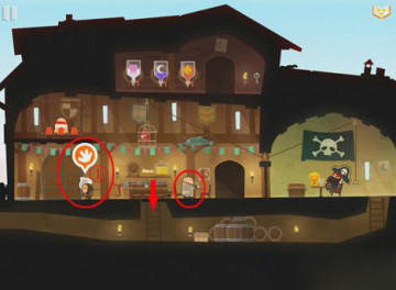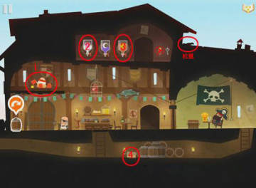 ②拿上酒壶接上标记月亮的酒。③之后在放回原来的桌子上去。④从地下室来到船长屋子里拉动绳索,让酒保进来倒酒,船长喝醉之后即可拿到金猴子。注意:要看清楚酒保的行动。