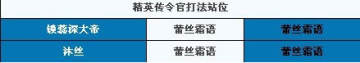 一号位为法T,三号为为非主力群攻输出,五号位为主力群攻,7号位则是放置群疗,剩下9和11同样放置群攻职业。这里群攻职业蕾丝、方砖、劣人都是可以的,只要保证秒掉对方后排即可。